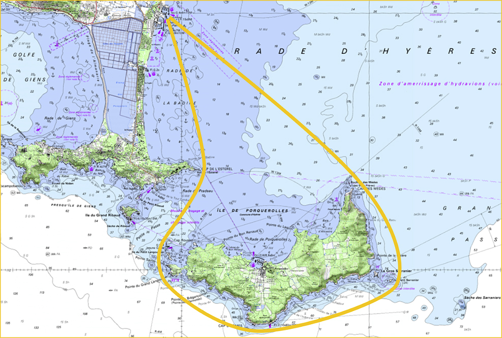 Le parcours contourne l’île de Porquerolles dans le sens choisi par le skipper, en laissant l’île de Porquerolles et ses annexes à l’intérieur du parcours (en particulier la Jeaune Garde, les Rochers des Mèdes et le Petit Sarranier).